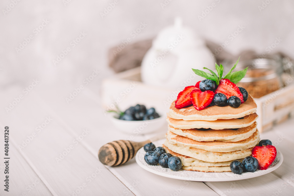 Classic american pancakes with fresh berry on white wood background. Summer homemade breakfast.