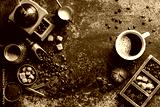 Coffee cup with coffee grinder and coffee beans on dark textured background.