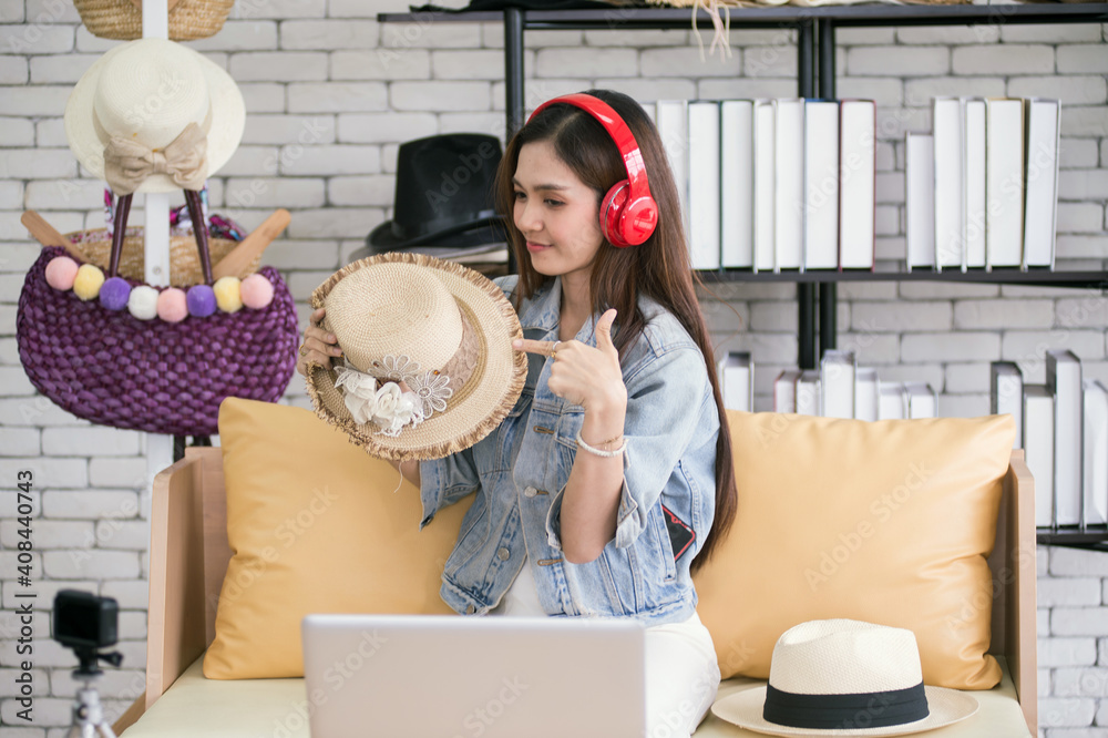 Young beautiful young woman, smiling face, working files, online products. The concept of selling products online