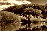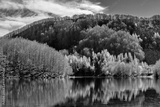 Black and white view of a quiet moment on Lake Santo Modenese on a sunny day, Pievepelago, Italy