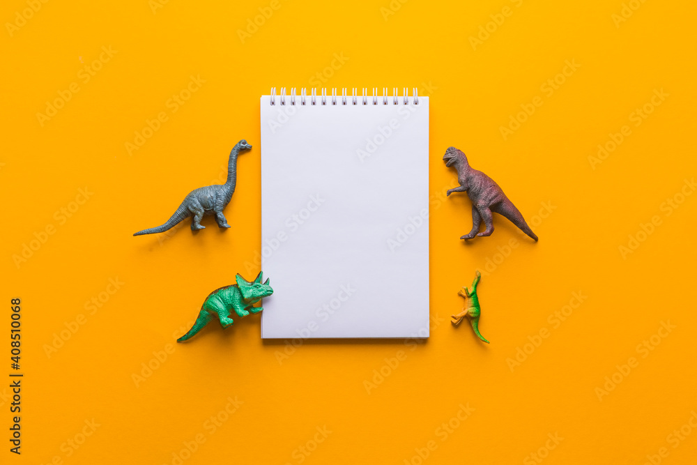 notepad or copybook and toys dinosaurs on a yellow background. minimalistic set composition. kids concept. top view, flat lay, mock up, place for text