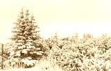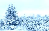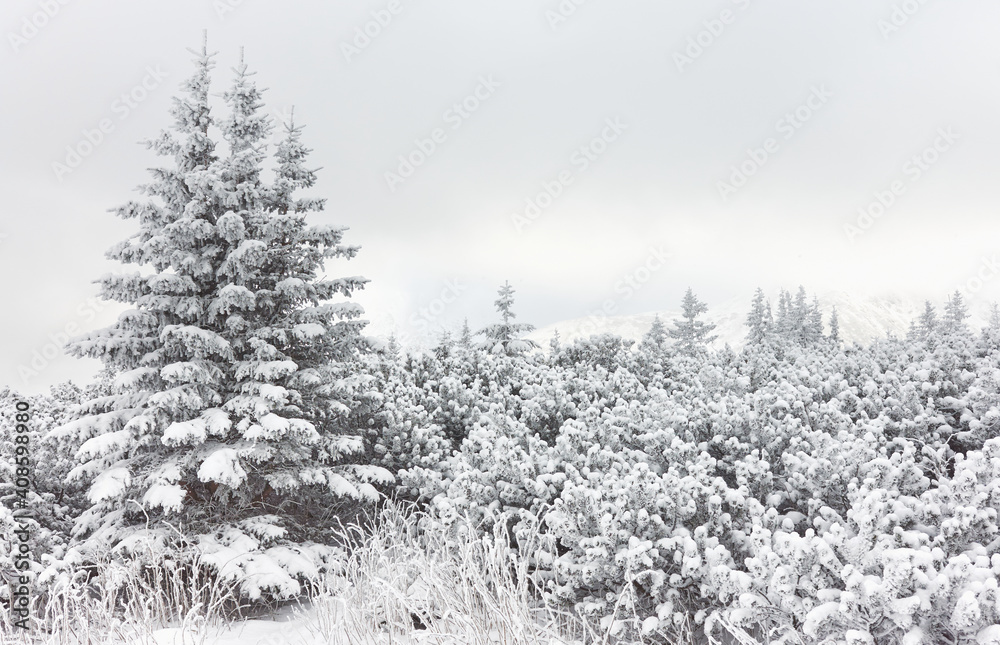 Winter mountain landscape with snow covered trees during fog.