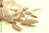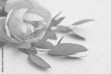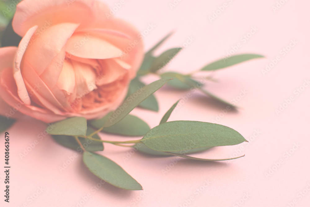 One beautiful pink rose with eucalyptus leaves on a pink background. Soft focus.