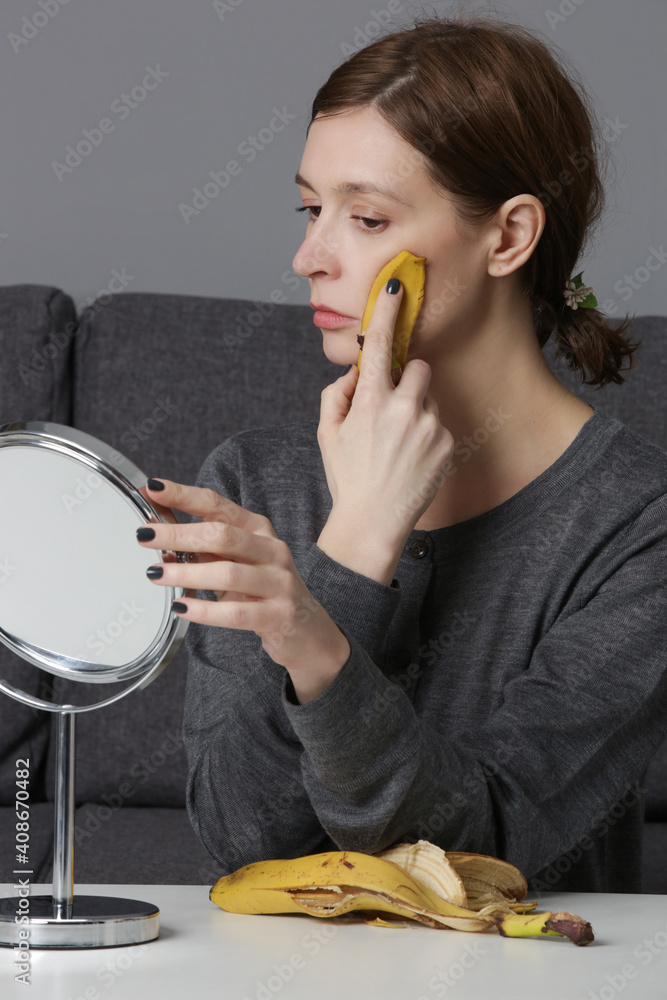 Woman rubbing banana peel on her face to brighten and hydrate skin and reduce wrinkles. Zero waste and natural skin care concept.