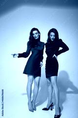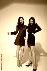 Two sexy beautiful woman friends brunette hair makeup wear glamour luxury fashion silk dress red and black color high heels party romantic date style model on white background accessory and jewelry.