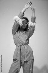 Pretty sexy woman beautiful face natural makeup brunette hair wear silk textile suit pants and blouse with feathers comfort casual home dress luxury lifestyle pajama party glamour fashion model.