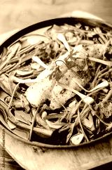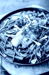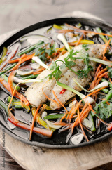 chinese style steamed fish fillet with vegetables on hot plate