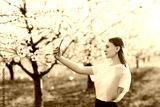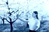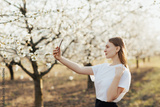 Young beautiful romantic blonde girl in white t-shirt taking a selfie in blooming spring garden.