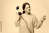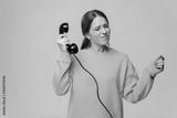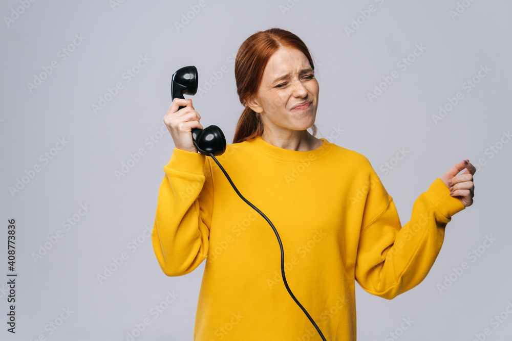 Unhappy young woman in stylish yellow sweater holding handset receiver of retro phone and turning head away from it, not wanting to hear what is being said to her.