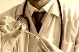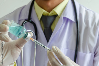 Doctors holding a syringe and a bottle of COVID-19 vaccine. Medical experimental vaccine treatment