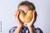 Trendy ugly vegetable, heart shaped potato in hands