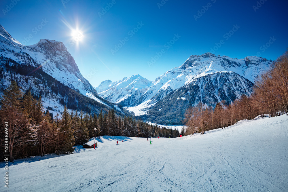 Ski trail on the sunny day in sunlit with French Alps mountains peaks and fir forest