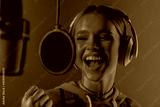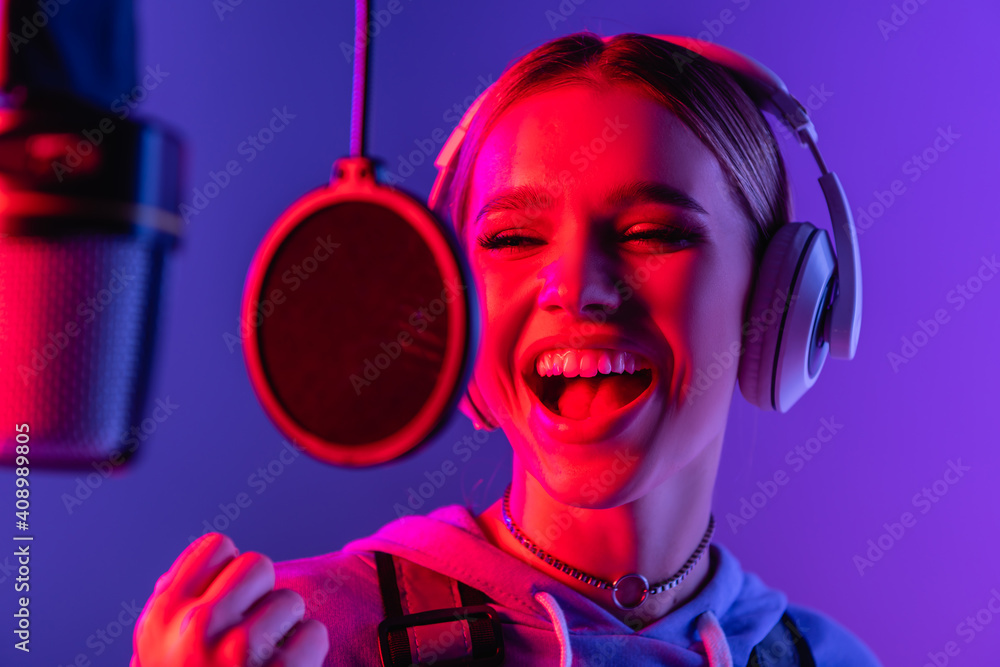 young singer in wireless headphones recording song while singing in microphone on blurred foreground