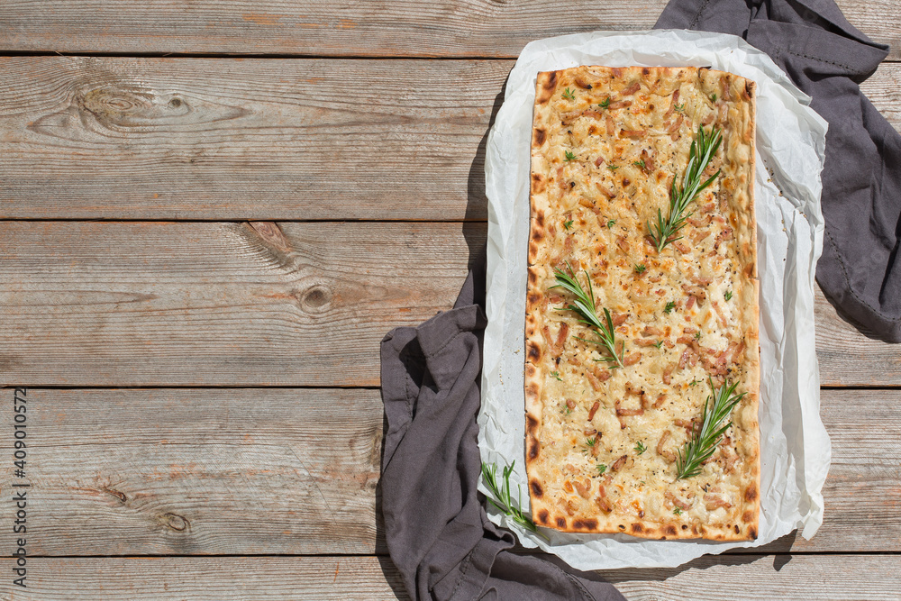 Flammkuchen, traditional German pizza with red onion, bacon, cream cheese