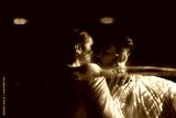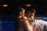 Couple kissing or hugging in the water. A girl in a dress with a long train and a guy are swimming in the water.