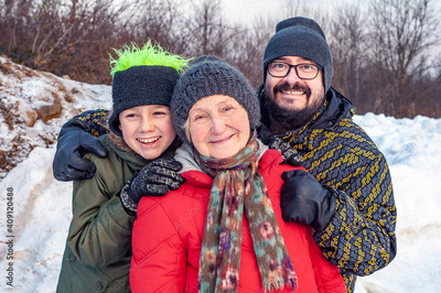 Happy grandson, grandmother, dad hug together in the snow winter. Active rest in the forest mountains. Family of different generations in sports clothing. Winter pastime, activities. Weekend rest