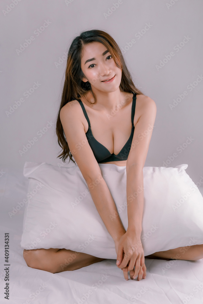 A sexy asian woman wearing a black bikini sits on the white bed.