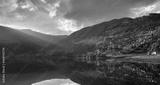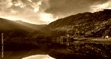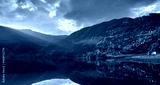 A panoramic view of the lake in Voss Norway, the water is still mirrored and the sun shines down in the evening, the house on the hill with beautiful trees in autumn.