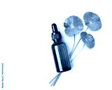 Top view of Gotu kola centella asiatica extract in amber bottle with fresh leaves isolated on white background.