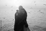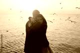 Silhouette of a young couple in love hugging on the sea beach at sunset with flying seagulls on the background.