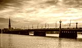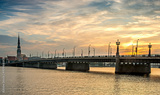 Morning view on waterfront and stone bridge and historical district of Riga - the capital city of Latvia where there are resting opportunities and unique medieval and Gothic architecture