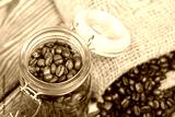 Coffee beans. Poured into a drag bag jar and linen bag. Close-up shot.
