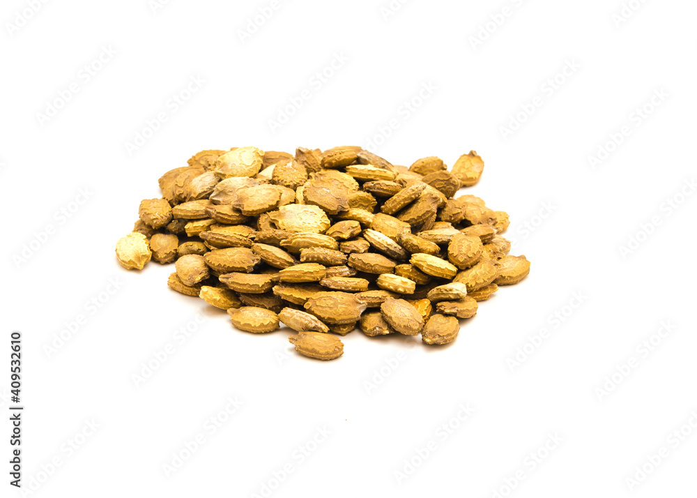 Top view pile of bitter melon Momordica charantia seeds isolated on white background