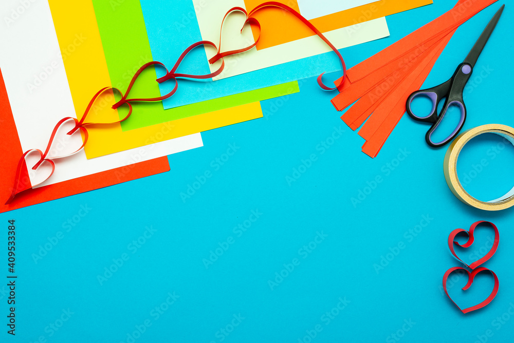 Background for creativity. Colored paper and paper hearts. Cut out of paper