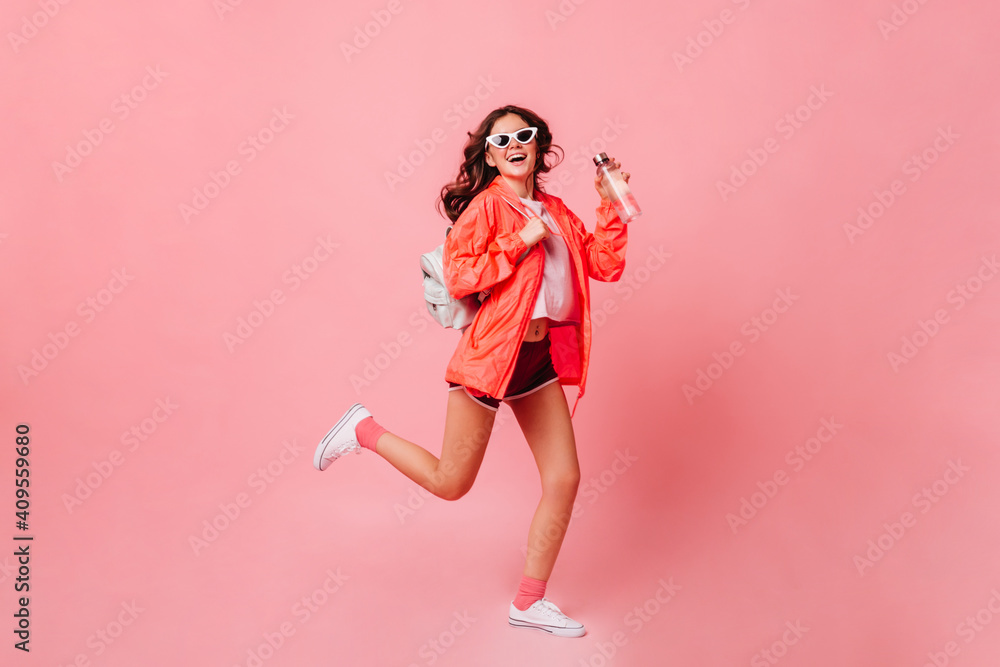 Sports girl in windbreaker, shorts and sneakers runs on pink background. Woman in sunglasses holding bottle of water
