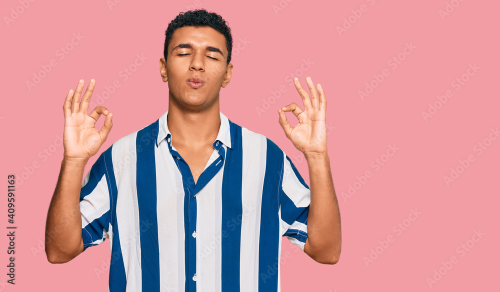 Young arab man wearing casual clothes relax and smiling with eyes closed doing meditation gesture with fingers. yoga concept.