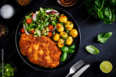 Breaded fried pork chop, French fries and vegetables on white background