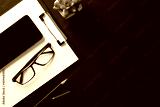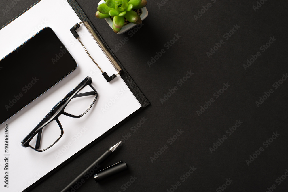 Flatlay view photo of workplace with clipboard smart phone eyeglasses and open pen isolated dark black backdrop