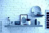 Shelves with decorative elements on white brick wall. Interior design