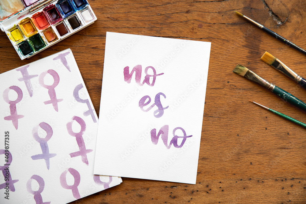 "no es no" watercolor postcards with woman symbols on wooden background with watercolors and brushes