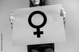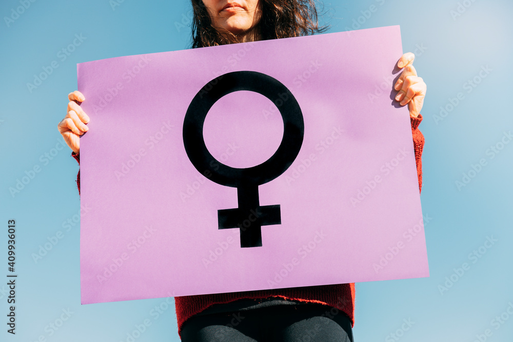 woman holding a purple feminist banner with the symbol of women. feminist concept