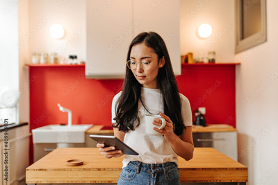 Asian girl in stylish clothes and glasses looks into tablet and drinks coffee in kitchen