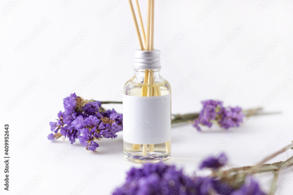 Incense sticks for home with floral scent. Flowers and dried flowers with aroma diffuser. Eco-friendly home fragrance concept. copy space