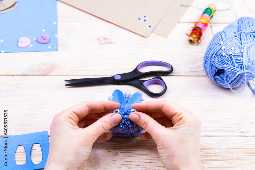 How to make a bunny from pom-poms for Easter decor. Children's art project. DIY concept. Hands make a blue Easter bunny out of a pompom. Step by step photo instruction