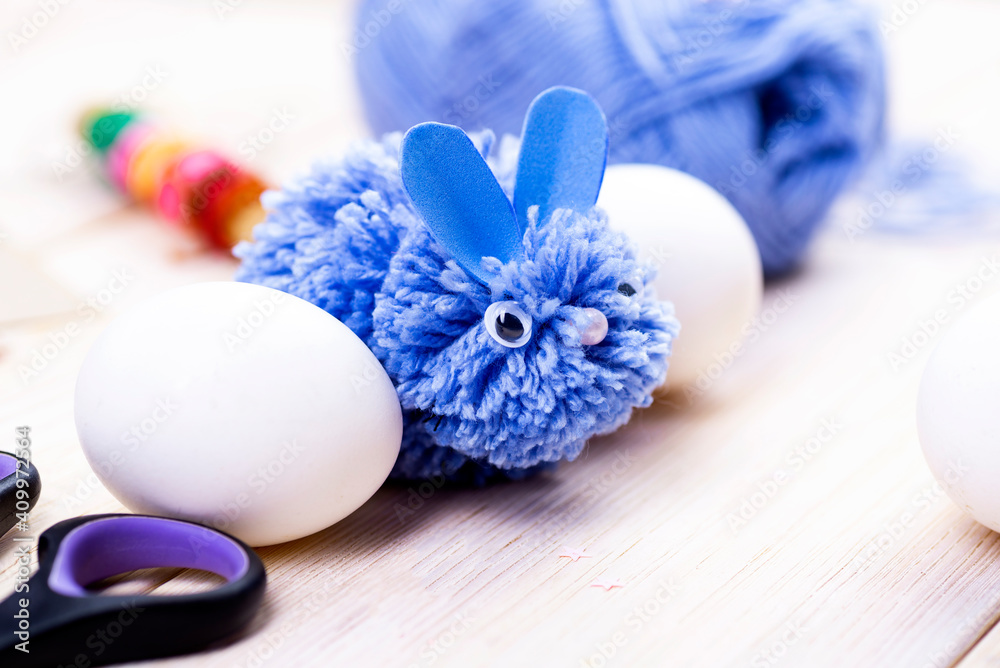 This blue rabbit is made of pompons for Easter decor by hand. Easter bunny and white eggs on a stand Children's art project. DIY concept