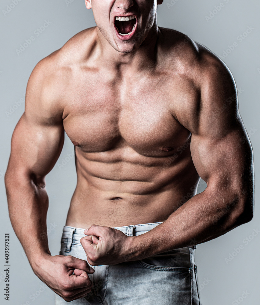 Screaming man with well trained body, biceps, abs and pecs and wearing. Muscular male strains muscles and screams. Muscular bodybuilder posing over white background