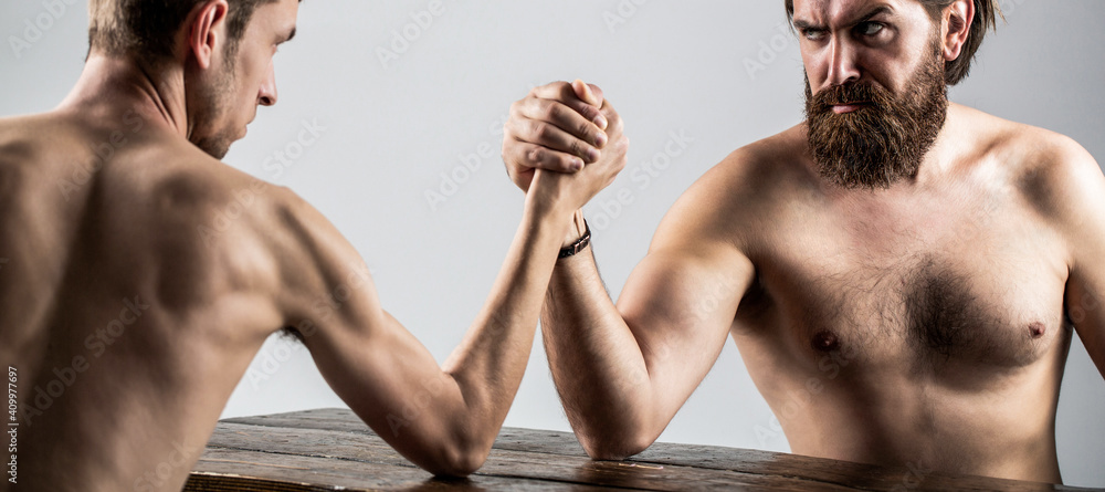 Arms wrestling thin hand, big strong arm in studio. Two man's hands clasped arm wrestling, strong and weak, unequal match. Arm wrestling. Heavily muscled bearded man arm wrestling a puny weak man