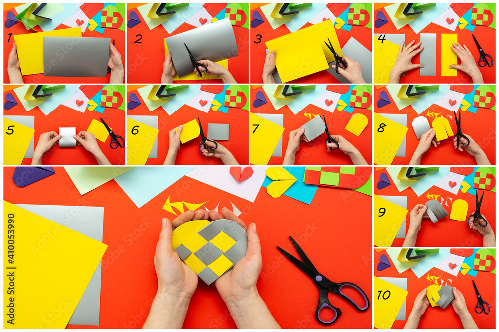 DIY instruction. Step by step guide. The process of making a paper heart from yellow and gray colored paper for Valentine's Day