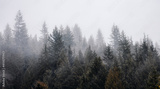 Rain Forest Trees Covered in White Fog during a rainy winter day. Near Squamish, North of Vancouver, British Columbia, Canada. Dark Art Mood. Nature Background Panorama