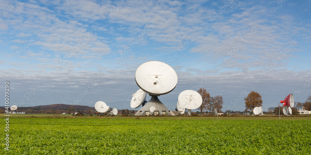 Satellite dishes of the Raisting Radome. With a green field in the foreground. Panorama format.