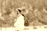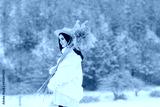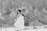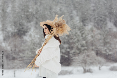 Fashionable young girl in trendy winter white clothes and hat poses with bouquet of reeds against the backdrop of an winter snowy landscape at snowfall.