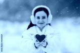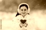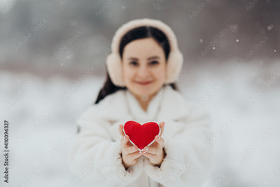 Happy girl in warm white clothes holding red heart on snowy background. Valentine's Day.