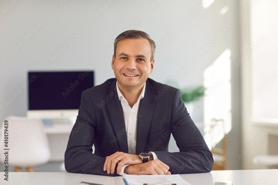 Smiling middle aged businessman in suit sitting and looking at camera during online videocall or interview with candidate in office over modern company interior. Working in office, online business