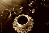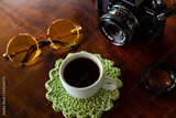 Xícara com café, câmera antiga e óculos com lentes amarelas sobre uma mesa de madeira.