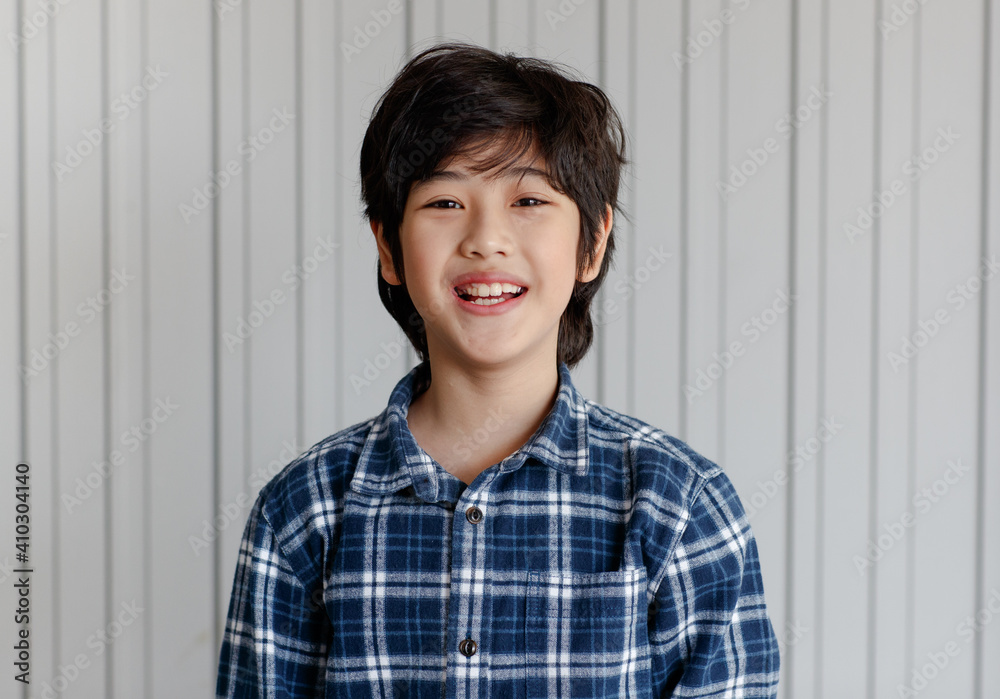 Asian good looking boy child is smiling, Happy little boy while posing at the camera on white background..