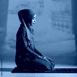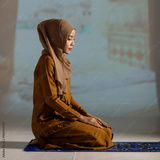 Portrait of a young and beautiful Muslim woman in red hijab dress sitting and meditating in the mosque.